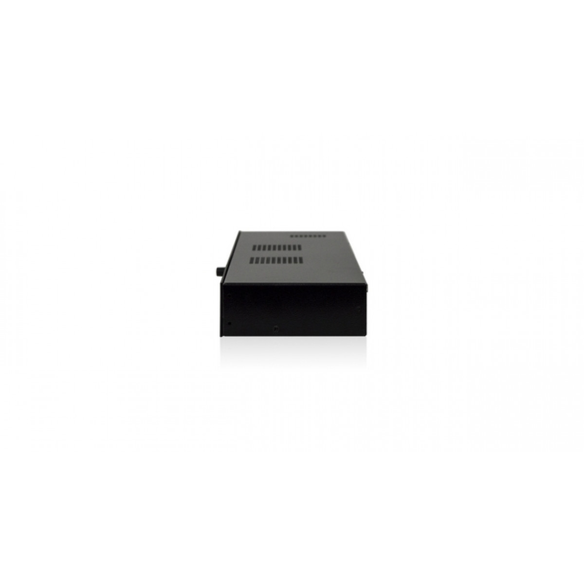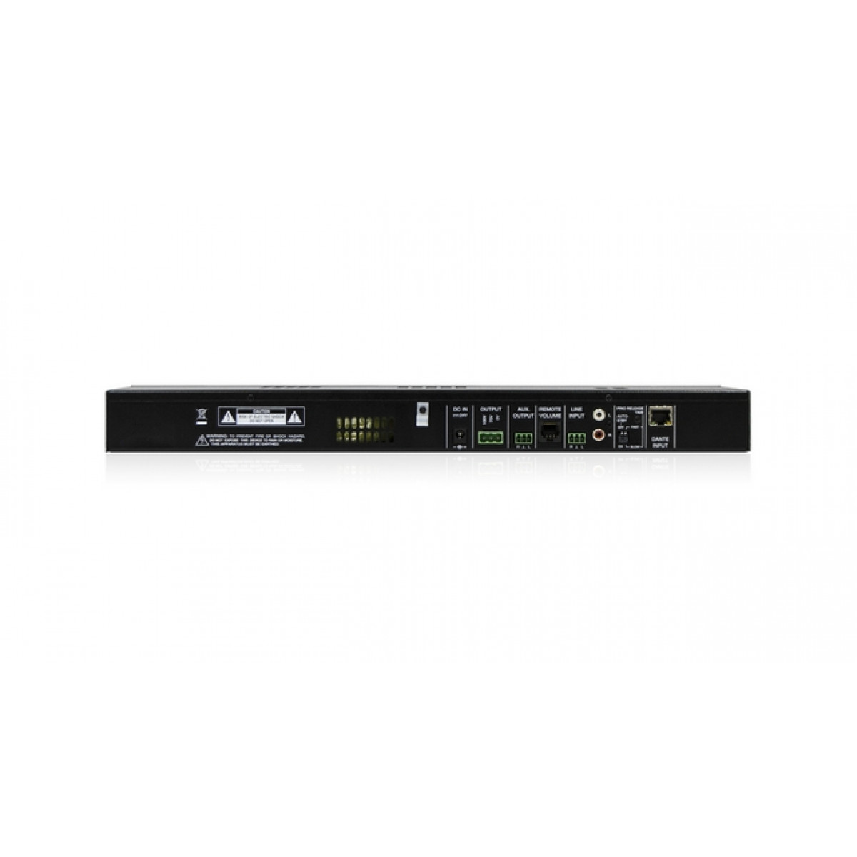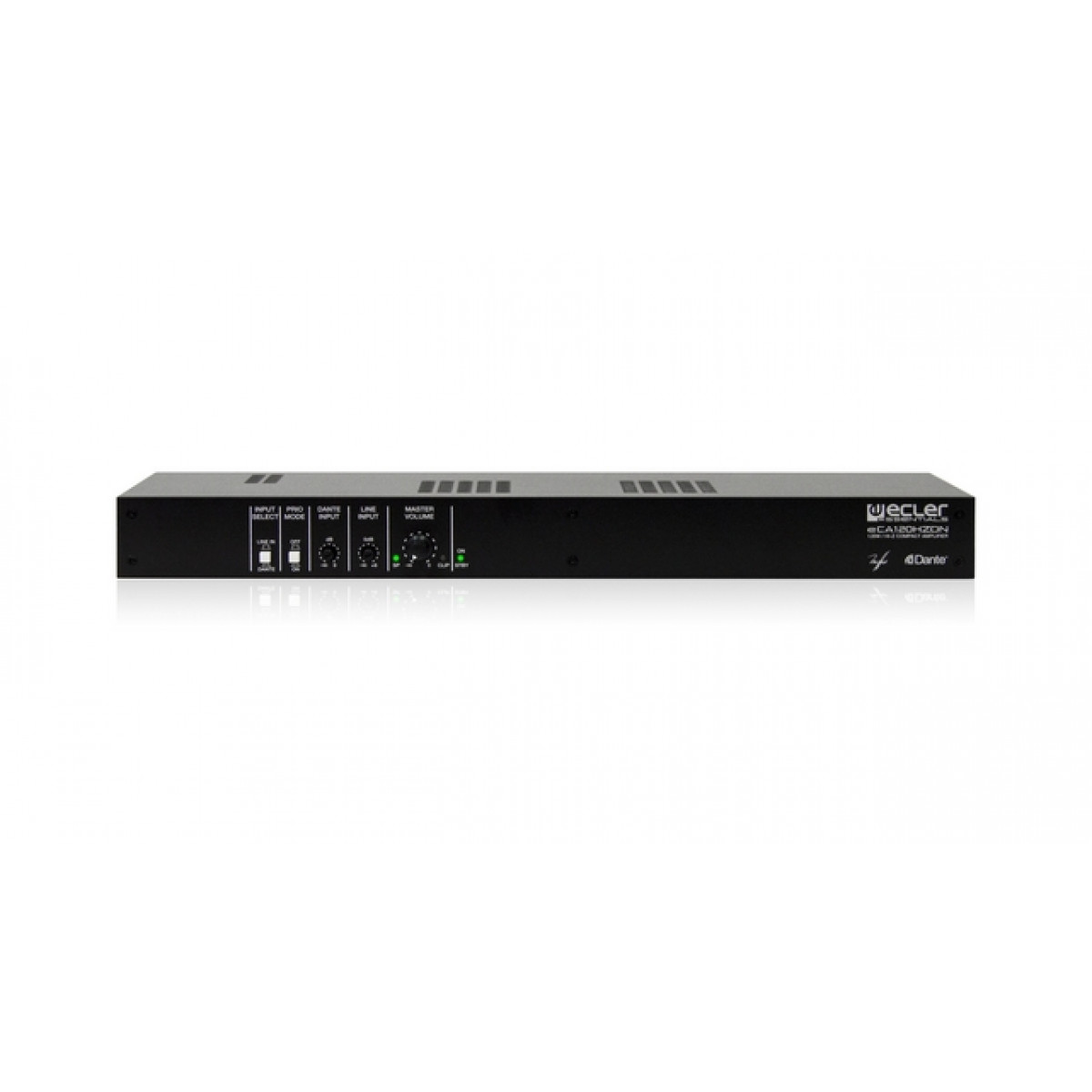 ECLER ESSENTIALS eCA120HZDN is a 120 WRMS @ 100V efficiency (class D) mono compact amplifier for high impedance lines. It features 2 x analogue audio inputs and 2 x Dante™ audio inputs, both with selectable priority function (over the other input signal) as well as an auxiliary audio output. Auto stand-by function (selectable) and fanless design (100% silent). It also has a remote control volume port compatible with ECLER WPm wall-panel control series. Universal external power supply included.