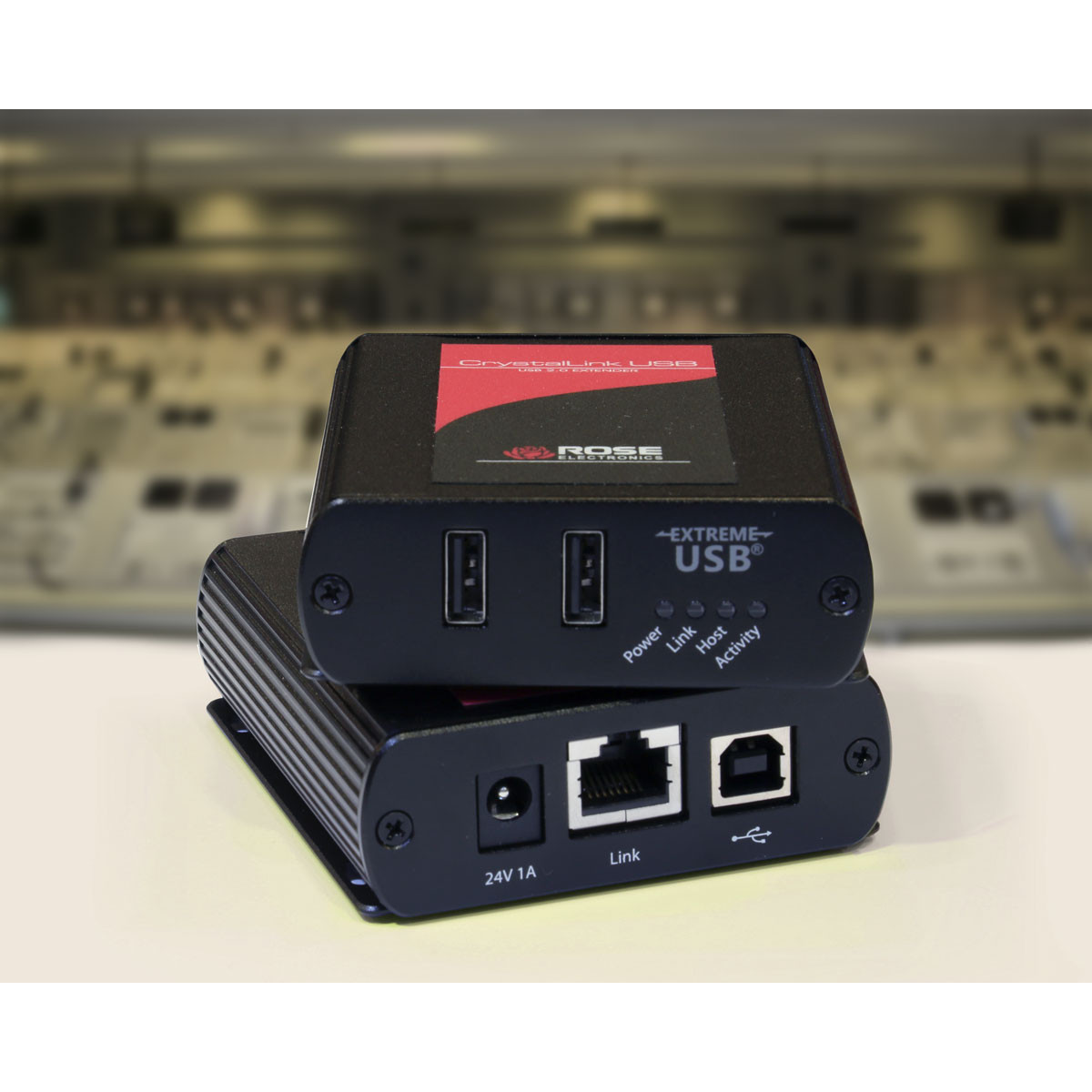 The CrystalLink USB2.0 Dual-Port extends devices up to 330 feet (100 meters) over CATx UTP/STP cable. Two USB devices such as a keyboard or mouse, USB disc drive, USB printer, or USB joystick can be extended away from the host PC. Additional USB devices can be connected using a powered USB hub. Up to 4 powered hubs can be cascaded at the remote end.