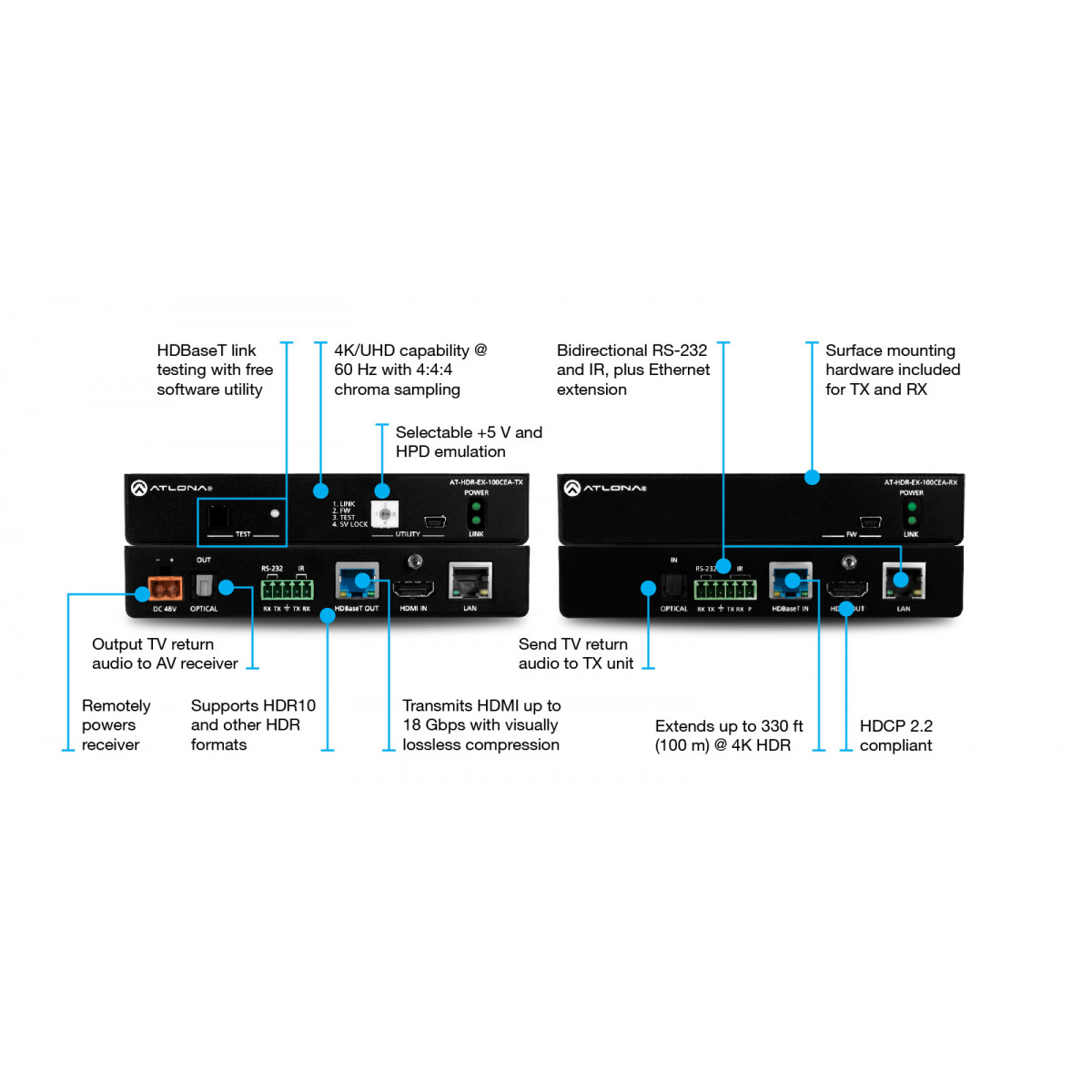 Extends RS-232, IR, Ethernet, and CEC control signals over HDBaseT