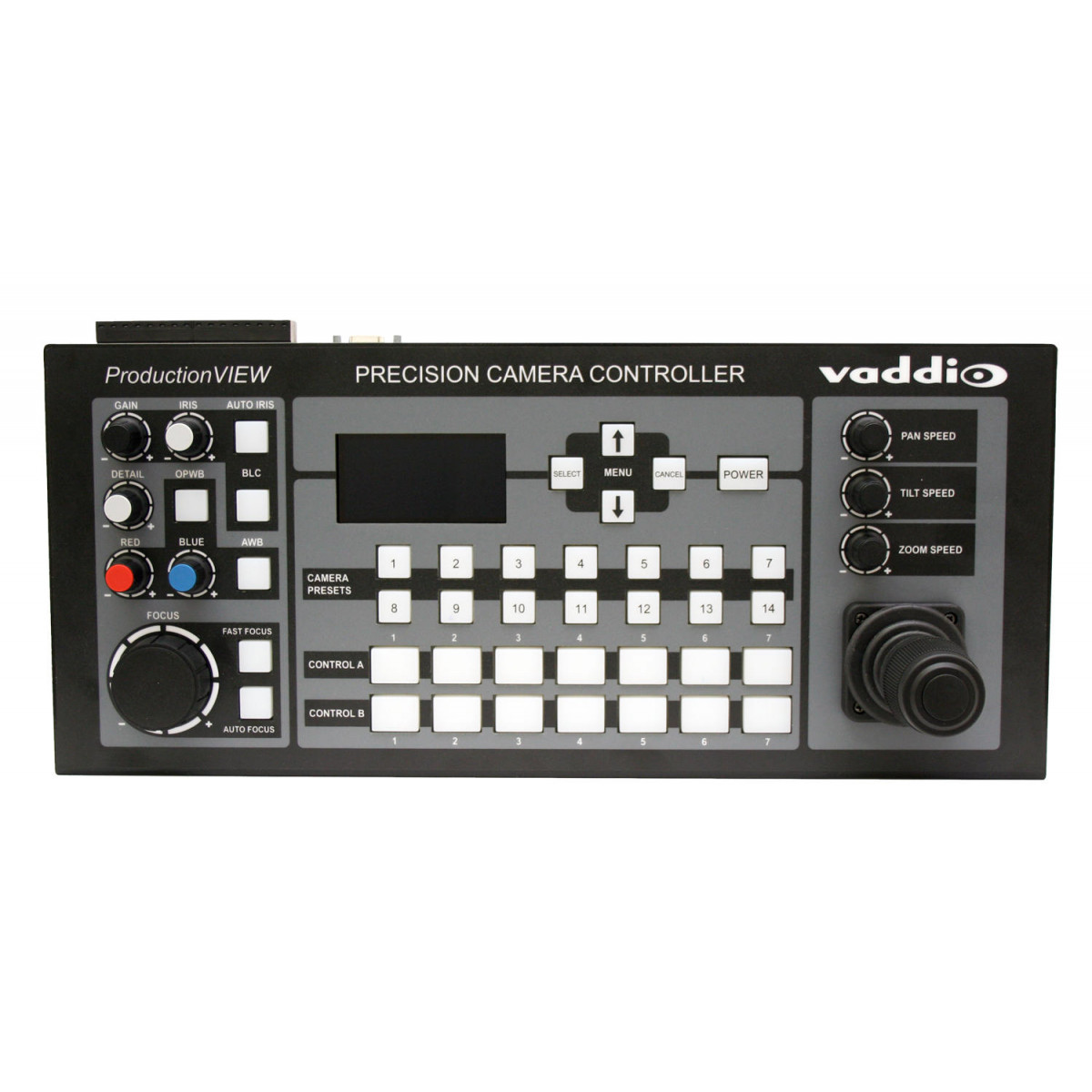 The Precision Camera Controller boasts a broadcast-quality joystick designed for smooth and accurate pan, tilt and zoom control, as well as CCU image control functionality for controlling up to seven PTZ cameras. By integrating CCU control into the system users can control red and blue gain, detail, and iris with adjustable gain with any Vaddio™ PTZ camera. One-push white balance (OPWB), auto white balance (AWB) and auto iris are also available to those who desire a more automated image control system. The CCU control surface gives system users real-time knobs and buttons to control each of these functions.